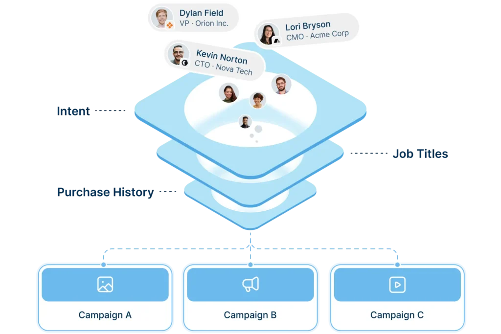 Our platform and integrations align these key firmographics, company purchase behavior, and intent signals with the digital identities of the decision makers that matter to build a custom, addressable segment.