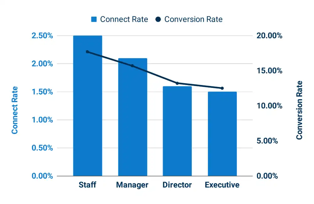 An unsurprising stat from our 28 million calls: 8.3% of call attempts are stymied by a gatekeeper. To overcome the gatekeeper roadblock, we advocate for account penetration tactics. Go in at the Staff and Manager level and gather valuable intelligence from the people who are proven to be easier to reach, and also more likely to talk to strangers.