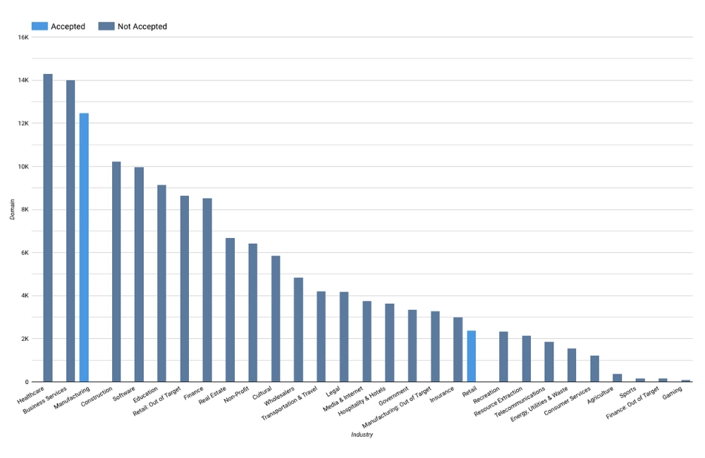 This customer’s intent topic list included about 30 topics centered around supply chain, demand, and inventory management. Their target account list initially focused on companies within manufacturing and retail industries, as shown by the “accepted” industries in blue.